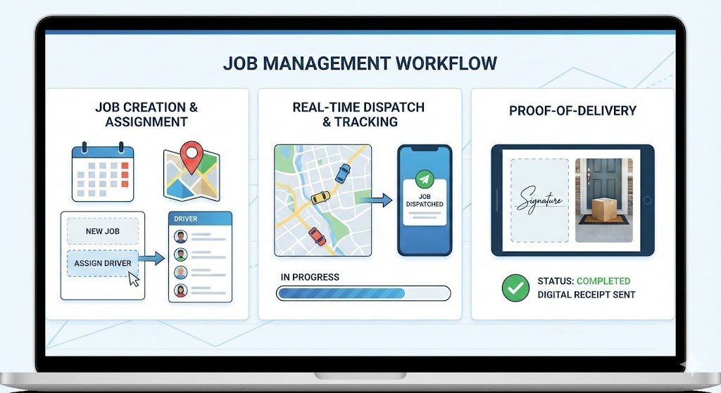 Create, assign, and dispatch jobs to drivers in real-time. Track job progress from start to finish with status updates and proof-of-delivery.