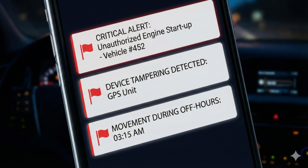 Get immediate notifications for critical events such as device tampering, unauthorized engine start-ups, or vehicle movement during off-hours.